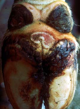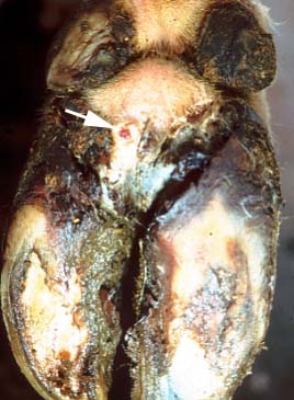 Gelegentlich sind auch im dorsalen Kronsaumbereich und im Zwischenklauenspalt