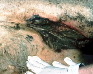 cm tiefe Löcher mit nekrotischen Hautteilen