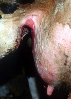 Im Euter-Schenkel-Spalt kommt es, überwiegend bei Erstkalbenden um den Zeitraum der Kalbung, durch Verminderung der Schweißabdunstung und Druck zur Störung des Säuremantels der Haut, Sekretstau, Hautmazeration, mitunter zu tiefen Nekrosen und bakterieller Infektion. Ist therapeutische Intervention nötig, sollte der Euter-Schenkel-Spalt täglich mit milden Desinfektionsmitteln gereinigt werden. Die Prognose ist nur bei Auftreten von umfangreicher Phlegmone schlecht. Die Heilung kann Monate dauern. |