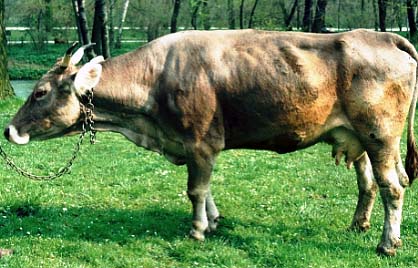 Chronische Vergiftung durch Pflanzeninhaltsstoffe mit Vitamin D-Wirkung. Im Alpen- und Voralpengebiet durch Goldhafer. Vitamin D fördert die Aufnahme von Kalzium aus dem Darm sowie die Kalziumablagerung in Knochen und anderen Geweben (vor allem in elastischem Bindegewebe wie Sehnen und Gefäßintima). Es kommt zu pathologischen Verkalkungen. Enzootische Kalzinose tritt als Gruppenerkrankung bei in gleicher Weise exponierten Tieren auf. Die Rinder magern ab, bewegen sich ungern, verharren beim Aufstehen lange auf den Karpalgelenken und halten im Stehen die Karpalgelenke leicht gebeugt. Palpatorisch ist keine Differenzierung der Strukturen von Metakarpus und Metatarsus mehr möglich. Anhand der klinischen Symptome kann eine Verdachtsdiagnose gestellt werden. Pathologisch-anatomisch bestehen ausgeprägte Verkalkungen in vielen Bindegeweben. Therapie nicht möglich. Prophylaktisch kann in betroffenen Regionen der Goldhafer in der Gräserpopulation durch häufigen Schnitt zurückgedrängt werden. Goldhaferreiches Heu sollte mit goldhaferarmem Heu "verschnitten" werden. |