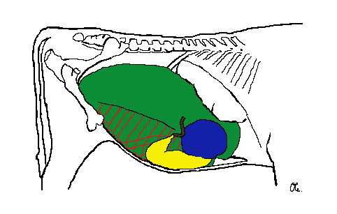 Ätiologie und Pathogenese ungeklärt, Zusammenwirken einer genetischen, mechanischen und Fütterungskomponente wird vermutet. Auftreten meist etwas später in der Laktation als die linksseitige LMV. Klinische Erscheinungen abhängig davon, ob neben einer Verlagerung auch eine Verdrehung des Labmagens vorliegt. Bei alleiniger Verlagerung wechselhafter Appetit, sekundäre Ketose, Klingeln rechts. Bei zusätzlicher Verdrehung akutes Krankheitsgeschehen: Dehydratation, Tachykardie, anfangs metabolische Alkalose, später Azidose, Blässe, wenig pappiger Kot. Kälber zeigen ein deutlich aufgetriebenes Abdomen. Klingeln und Plätschern rechts, kein Leberperkussionsfeldd. Diagnose klinisch, Therapie chirurgisch (s. Skript Chirurgie). Laparotomie mit Reposition und Fixation des Labmagens. Energische Flüssigkeitstherapie. |