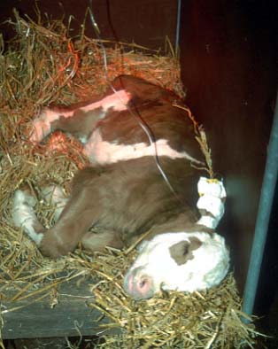 Bild links: Kalb mit schwerer Blutazidose. Das Tier wird über eine