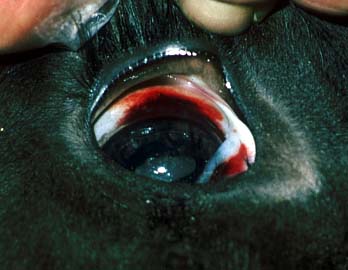 Hämorrhagische Diathese: flächenhafte subsklerale Blutung