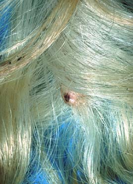 im Bereich der Haarbälge (s. Foto unten) und es kommt zur Bildung von rötlichen Krusten. Schließlich platzt die