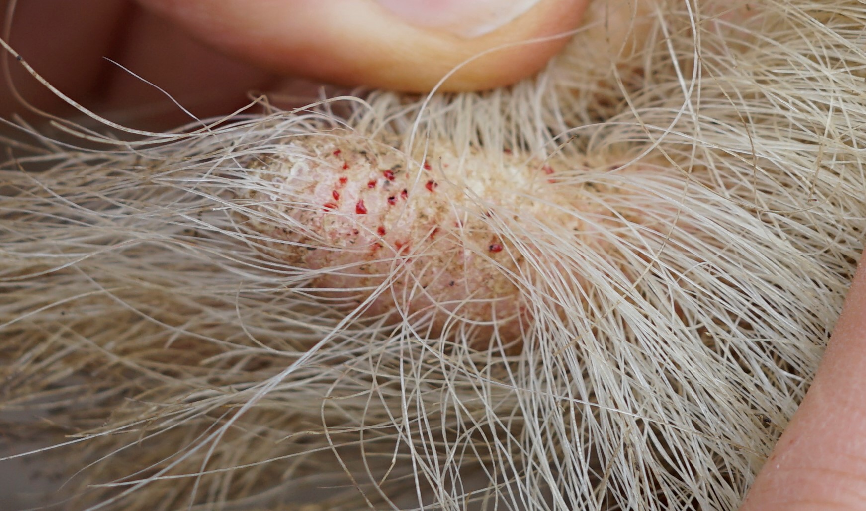 Anfangsstadium?: Im Bereich der Haarbälge sind kleinste Blutungen erkennbar.