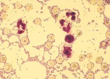 Vermehrung segmentkerniger Leukozyten und massenweise Stäbchen (E.