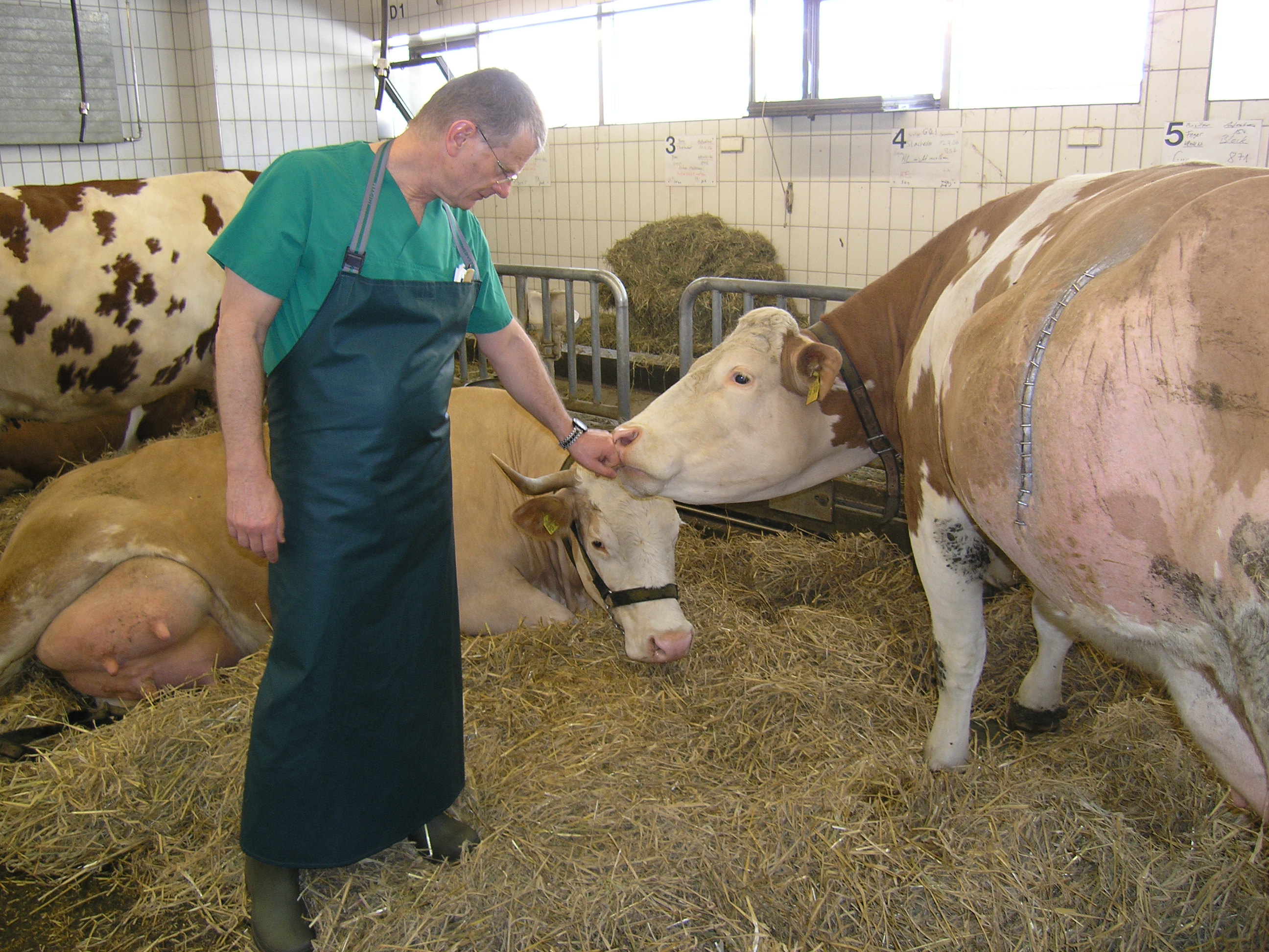 Schwanz: Wenn der Untersucher zwischen zwei Kühen war und zurück auf die Stallgasse treten will, schlagen Kühe nicht selten mit dem Schwanz, was schmerzhaft „ins Auge gehen kann“. Daher ist es ratsam, in dieser Situation beide Hände neben und leicht vor dem Kopf zu halten.
