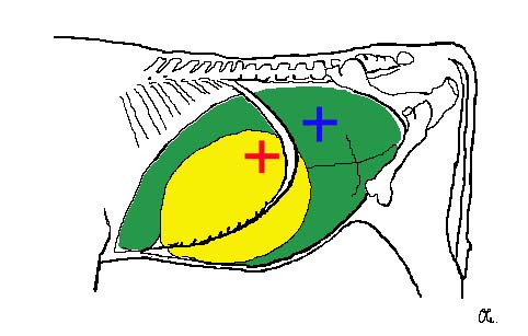 Doppelauskultation: wenn in der linken Hungergrube (blaue Markierung) Pansenmotorik zu hören ist, wird auch ventrokranial der Hungergrube über der rippengestützten Bauchwand (rote Markierung) auskultiert. Liegt unter dieser Stelle der nach links verlagerte Labmagen, so ist hier keine Pansenmotorik zu hören (das Gas im Labmagen leitet Schall schlecht), aber evtl. spontane metallische Labmagengeräusche.