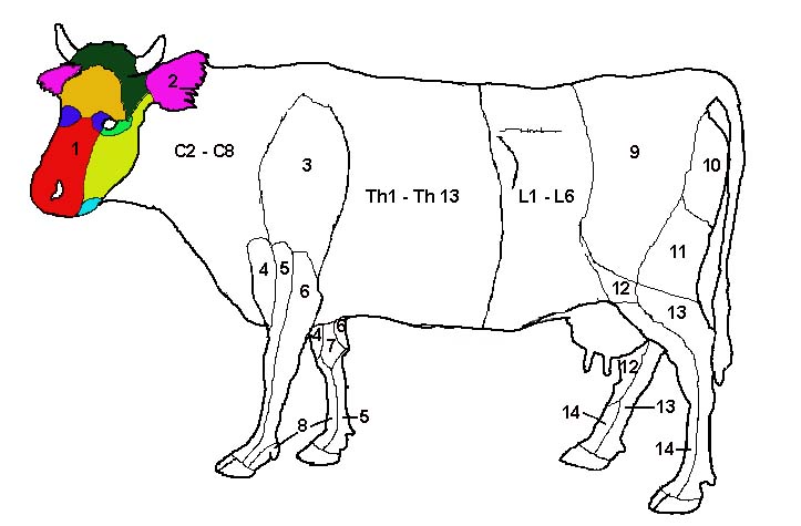 Die Darstellung ist schematisch, am lebenden Tier überlappen sich die sensiblen Hautareale gegenseitig.